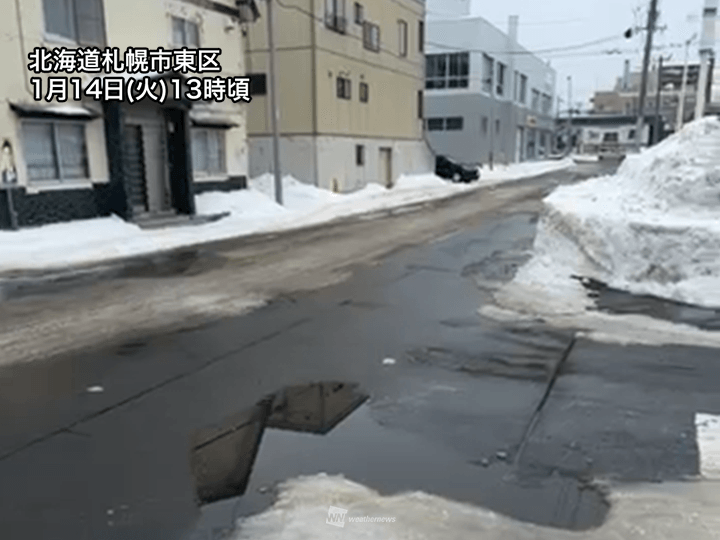 今日14日(火)の北海道は寒さが和らぎ、プラスの気温になっている所が多くなっています。気温が上がったため路面の雪はだいぶ溶けましたが、夜間の冷え込みによる凍結に注意が必要です。