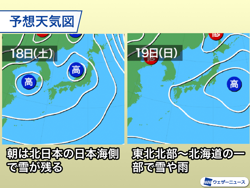 18日(土)は高気圧が本州付近に移動して、冬型の気圧配置が弱まります。日本海側は朝まで雪の降る所があるものの、強まることはない見込みです。ただ、前日までの大雪の影響が残る可能性があるため、少し時間に余裕を持った行動が安心です。