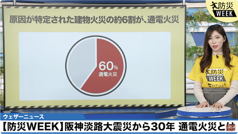 サンシャインの時間では、なぜ通電火災が起こるのか?どうやって防ぐのか?通電火災の特徴と対策を取り上げています。
