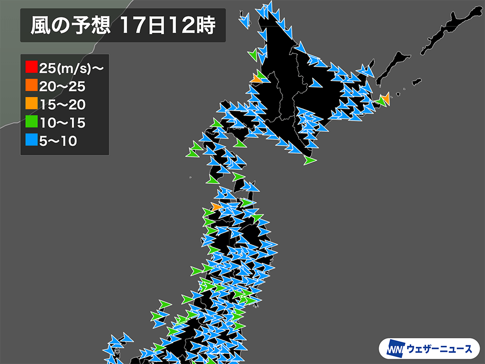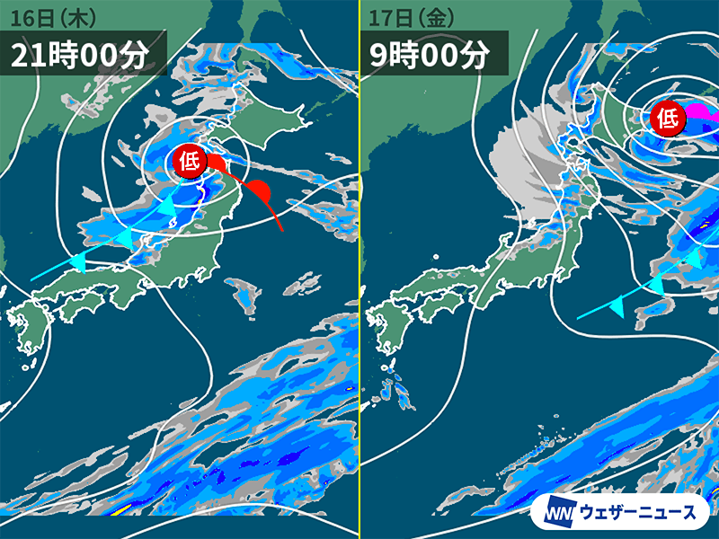 低気圧は明日17日(金)午前中にかけて北海道の南の海上を東進し、北海道の道東太平洋側、東北太平洋側でも雪が強まり、風が吹き荒れます。太平洋側では荒天のピークと通勤時間が重なる可能性があるので注意が必要です。午後は天気が回復に向かいますが、急増した積雪による路面の悪化にも注意してください。