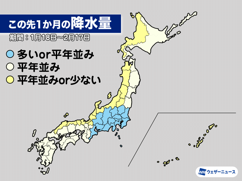 一方、太平洋側のエリアでは降水量は概ね平年並みの予想となっています。