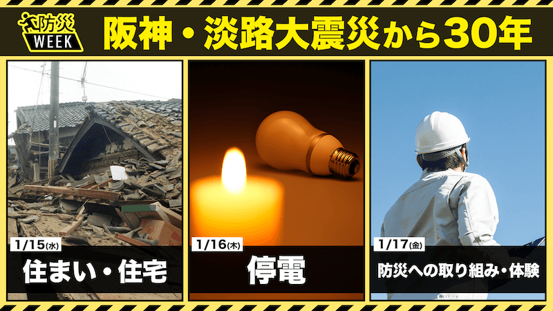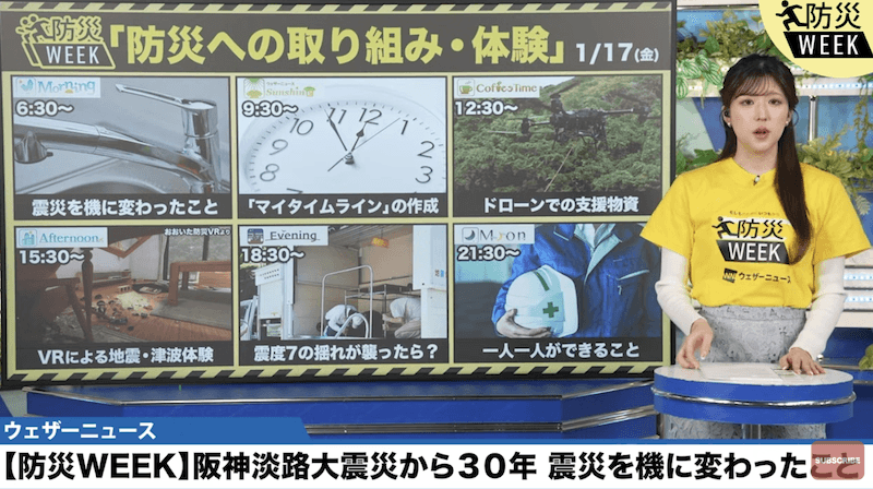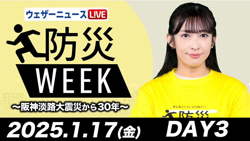 ウェザーニュースでは気象情報番組「ウェザーニュース LiVE」にて2025年1月15日(水)〜17日(金)にかけて「防災WEEK」を実施。阪神淡路大震災を教訓に地震災害への意識を高め、期間を通して最新の防災や減災について皆さんに参加してもらいながら一緒に学び、考えていきます。