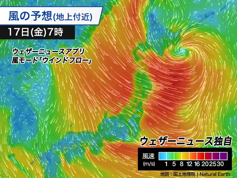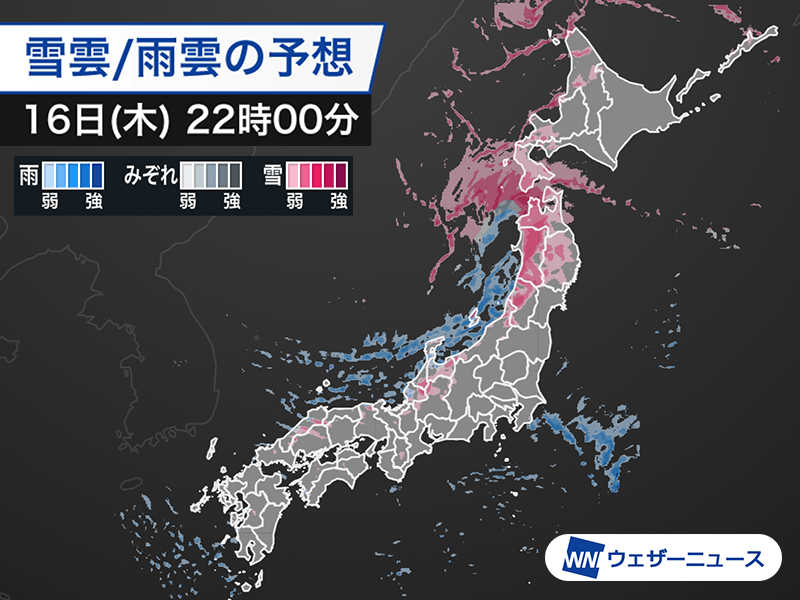 発達した低気圧は今夜遅くから明日17日(金)午前中にかけて北海道の南の海上を通過します。北海道道南や道東太平洋側、東北太平洋側でも雪が強まり、風が吹き荒れます。