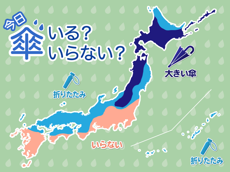 北日本の太平洋側や、北陸、山陰も雪雲や雨雲が流れ込みます。外出には最低でも折りたたみ傘があったほうが良さそうです。