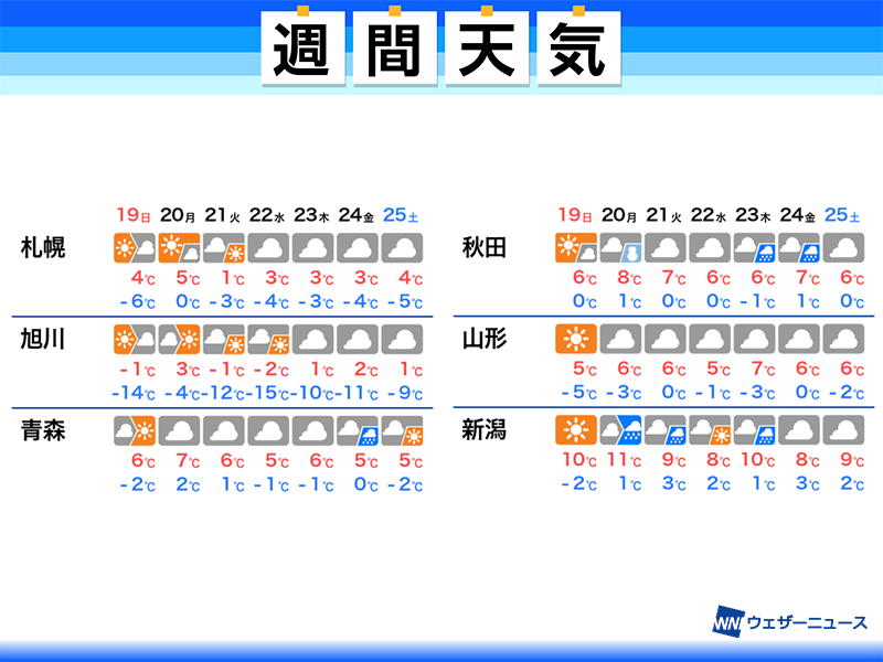気温が高くなるので、屋根からの落雪や雪崩、融雪による路面のぬかるみなどに注意が必要です。来週の後半は天気の崩れる可能性があるものの、気温が高く東北北部でも雨になるところが多い見込みです。