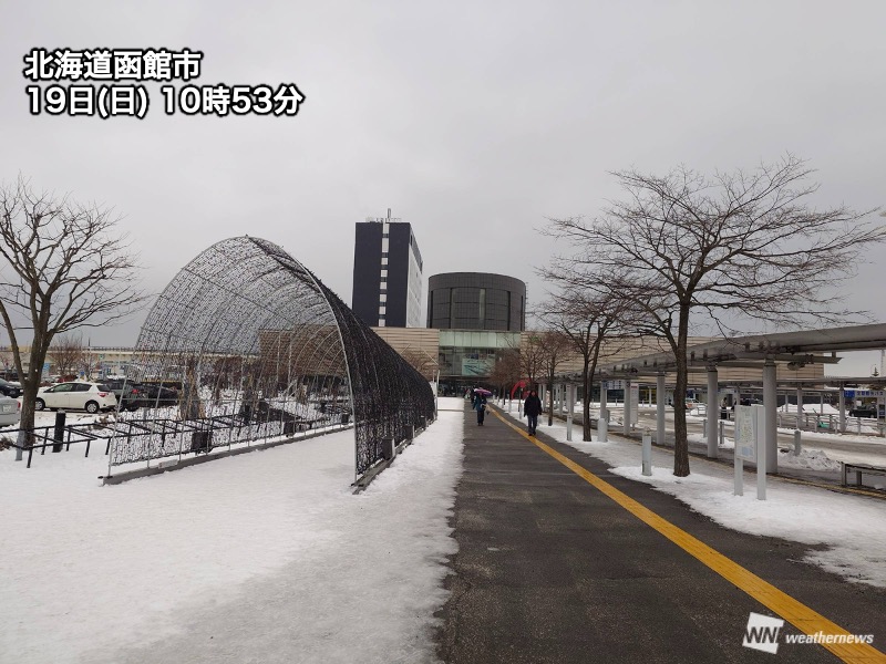 日本海から道南付近には前線帯があります。上空の寒気が北上しているため、プラスの気温となっている函館市ではみぞれや雨になっている状況です。