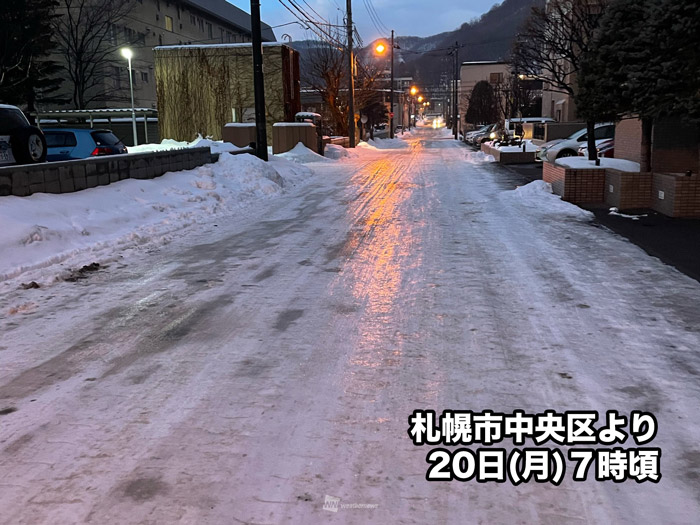 北海道でも道南や道央を中心に冷え込みが弱まり、札幌では7時までの最低気温が0.5℃とプラスの気温となっています。ウェザーニュースのアプリ利用者からの報告によると、雪ではなく雨が降っているという声もあり、道路の雪が溶けてツルツルでかなり滑りやすい状態となっていることが写真からもわかります。