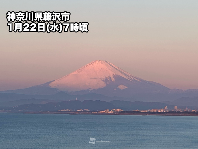 今日22日(水)は、朝陽で赤く染まった富士山が見られました。富士山周辺からに加え、都内など関東からも多くの富士山リポートが寄せられています。