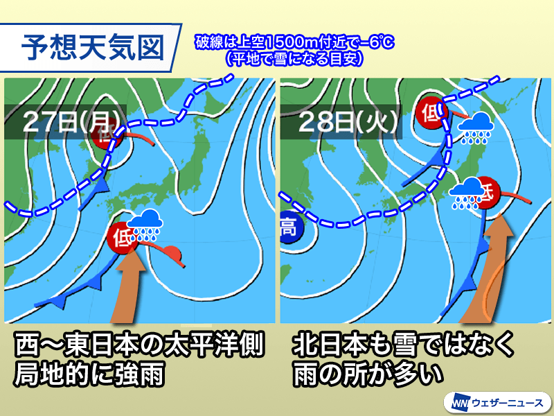 平地で雪になる目安の上空1500mで−6℃以下の寒気が大きく北に退くため、北日本でも平野部では雨の所が多くなる見通しです。雪が多く残っている地域では融雪が急速に進み、市街地では屋根からの落雪や路面状況の悪化、山間部では雪崩の危険性が高まります。