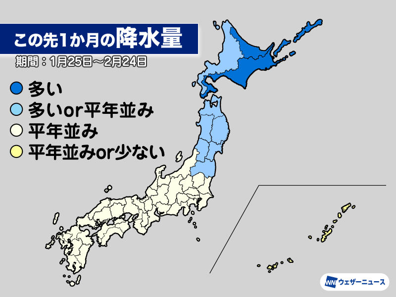 北日本は低気圧の影響を受けやすい時期があり、この先1か月の降水量は平年並みか多くなる予想です。寒気が弱いため、降雪量としては平年並みの予想となっています。