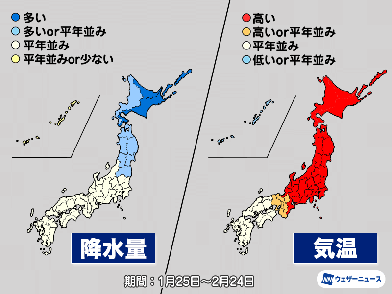 現在、暦の上では「大寒」ですが、ここ最近は上空の寒気が弱く季節先取りの暖かさになっています。この先1か月も北日本や東日本は上空1500m付近の気温が平年より高い傾向が続き、寒気の影響を受けにくいため、気温は平年より高い予想です。