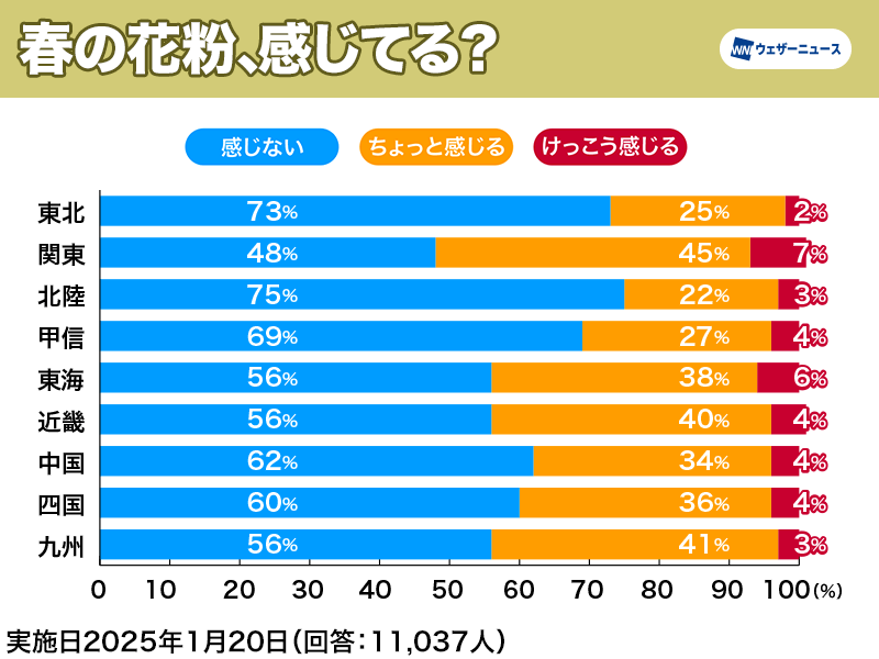 ウェザーニュースは、アプリユーザーを対象に「春の花粉、感じてる?」という質問でアンケート調査を実施しました。その結果、「花粉症ではない」の回答を除くと、全体のおよそ半分の方が春の花粉を感じていることがわかりました。