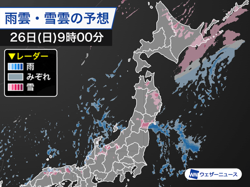 明日26日(日)は上空の強い寒気の影響で東北や北陸、山陰では雪や雨の降るところがあります。西日本から関東にかけては日差しが届いて、日中は比較的過ごしやすくなりそうです。