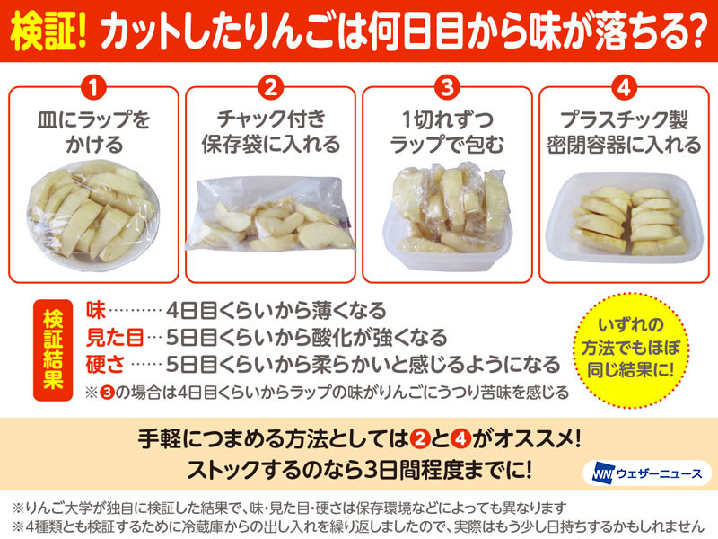 「いずれも、1〜2日目は味やシャキシャキ感など十分に保たれ、見た目がほんの少し変化する程度。3日目でりんごの味が薄くなりはじめるが、ほぼ味は変わらなかったです。その後、味や硬さが変化してフレッシュ感が失われはじめ、6日目では味・見た目・硬さが本来のものではなくなりました。