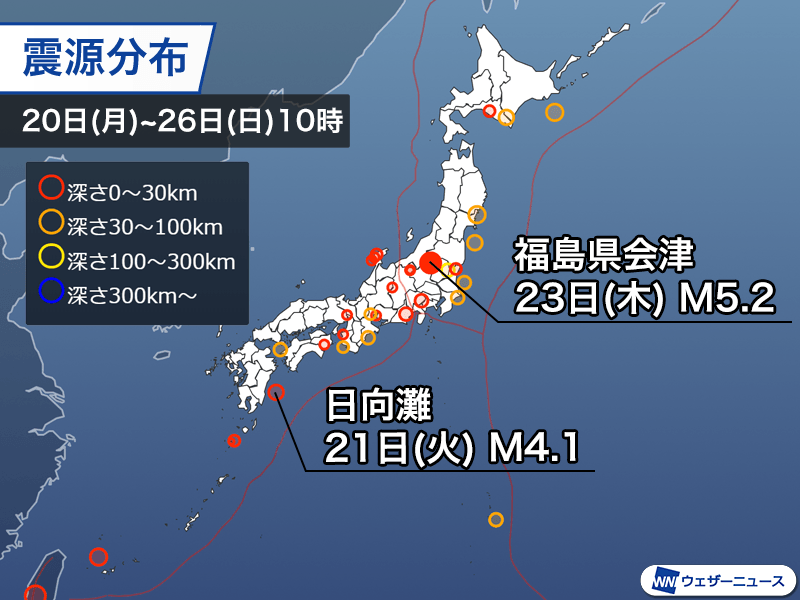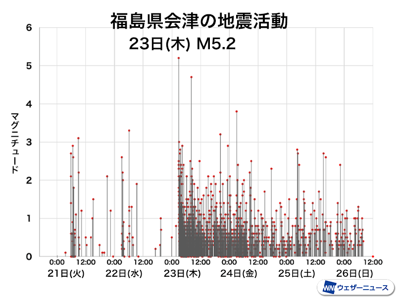 マグニチュード5.2の地震の発生後は活動が活発になり、23日(木)だけで有感地震は43回を数え、震度3以上の地震は26日(日)10時までに6回起きています。(震度5弱の地震はのぞく)