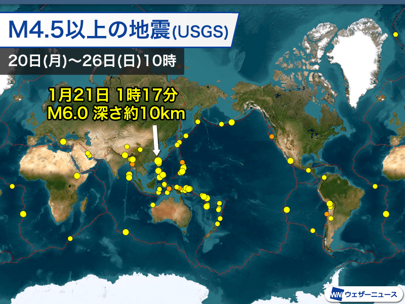 アメリカ地質調査所の解析によるマグニチュード6以上の地震は1回発生しました。最も大きな地震は台湾で発生したマグニチュードは6.0です。