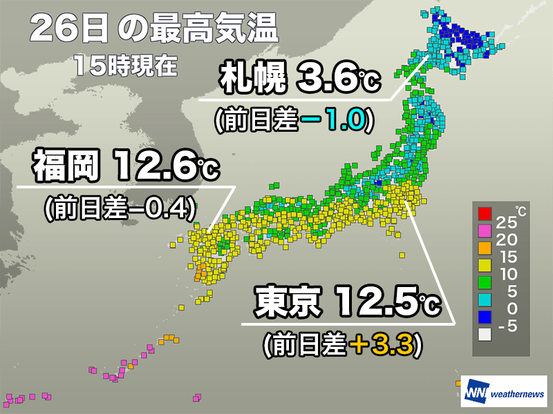 関東から西日本の太平洋側は晴れた所が多くなりました。日差しが増えた関東は気温が上昇し、15時までの最高気温は東京都心が昨日に比べて3.3℃高い12.5℃、横浜市は2.1℃高い12.1℃を観測しています。