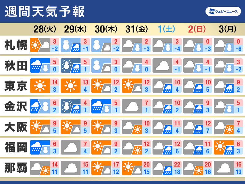 西回りで強い寒気が流入するため、西日本はこの時期らしい寒さとなります。福岡では明日28日(火)は雨に雪が交じるとみています。大阪でも週中頃は最高気温が一桁となりそうです。