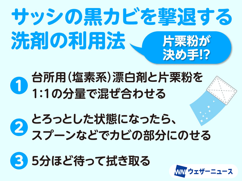 「そこで役立つのが、片栗粉を使う方法です。キッチンブリーチなどと片栗粉を1対1の分量で混ぜ合わせ、ペースト状に練り上げてください。それを使い捨てスプーンか割り箸で黒カビの上にかぶせるようにのせるのです。5分ほど待って拭き取ると、黒カビを取り除くことができます」(尾崎さん)