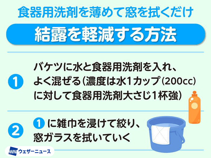 「サッシ窓の結露を抑える裏ワザをご紹介しましょう。結露は乾拭きしている人が多いと思いますが、乾拭きではなく食器用洗剤を薄めて窓を拭けばいいのです。