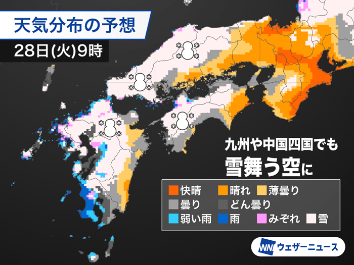 九州北部や山陰、四国西部では市街地でも雪が降り、うっすらと路面に雪が積もる可能性があります。大雪には至らない予想ですが、車の運転や足元など滑りやすくなることが考えられるので十分に注意してください。