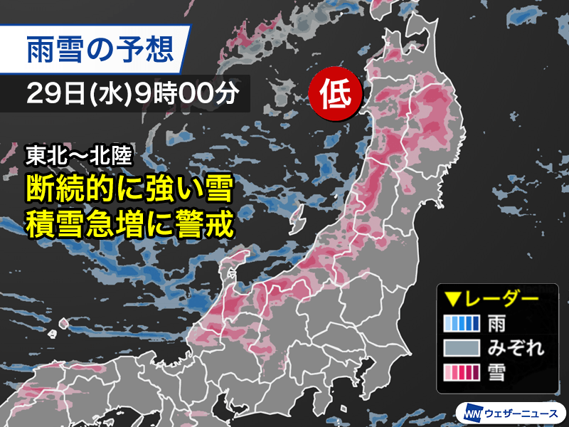 明日29日(水)は低気圧の通過に伴い、北陸、東北では積雪が急増する見込みです。