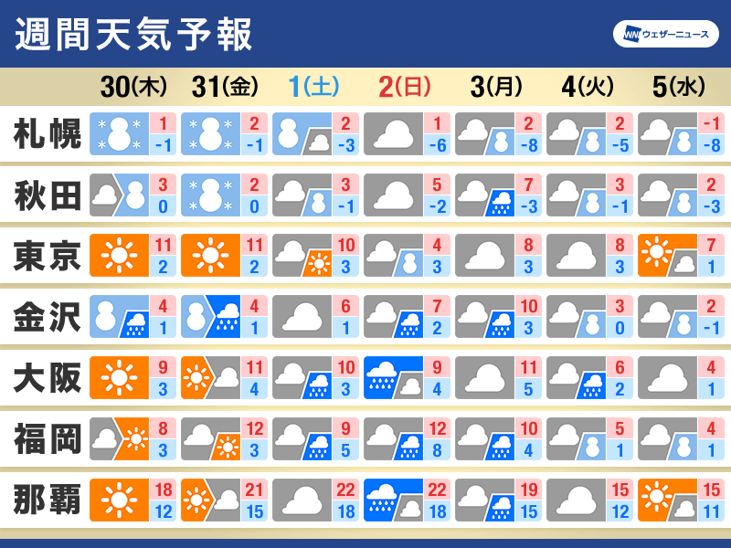 31日(金)は広く高気圧に覆われるものの、2月最初の週末となる1日(土)、2日(日)は、西日本から東日本の南岸を低気圧が通過する予想です。西から東日本の広範囲で雨や雪の降る見込みです。