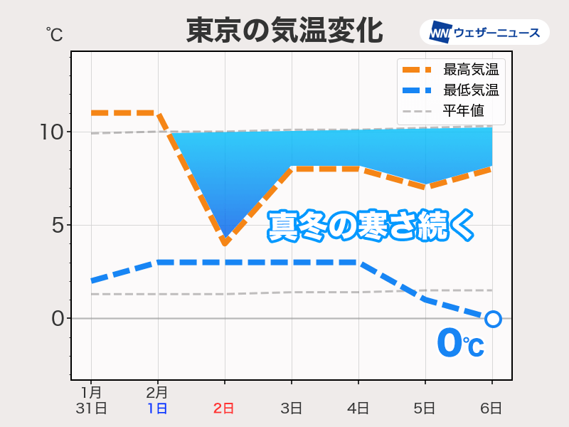 東京都心は1月下旬になってからほとんどの日が最高気温10℃以上で、寒中の割にそれほど寒くありません。ただ、2月に入ると状況が一変しそうです。