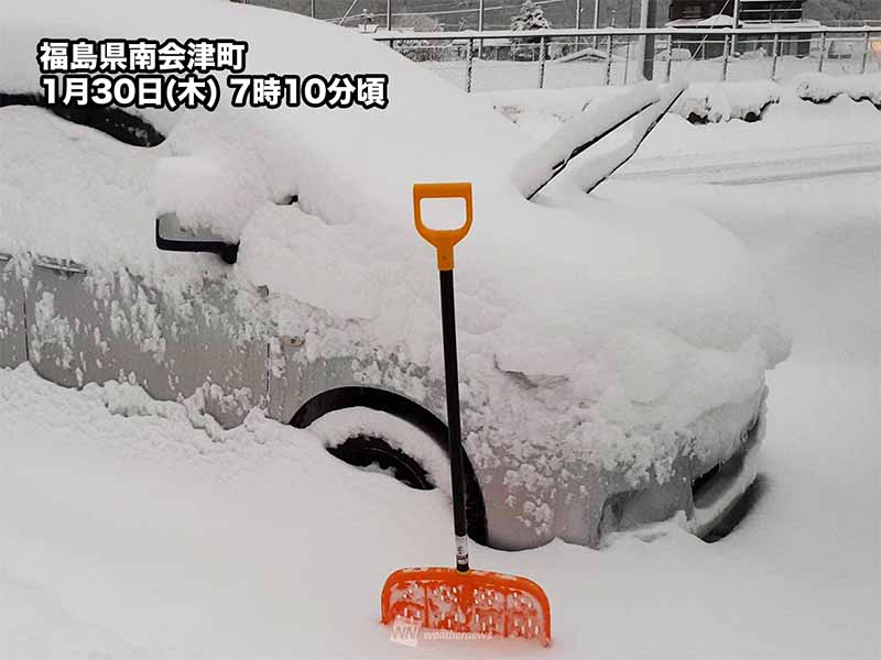 7時までの6時間に福島県金山町で30cm、会津若松市で15cm、新潟県魚沼市・守門で16cmの雪が降りました。7時00分の時点で福島県会津に大雪警報が出ています。