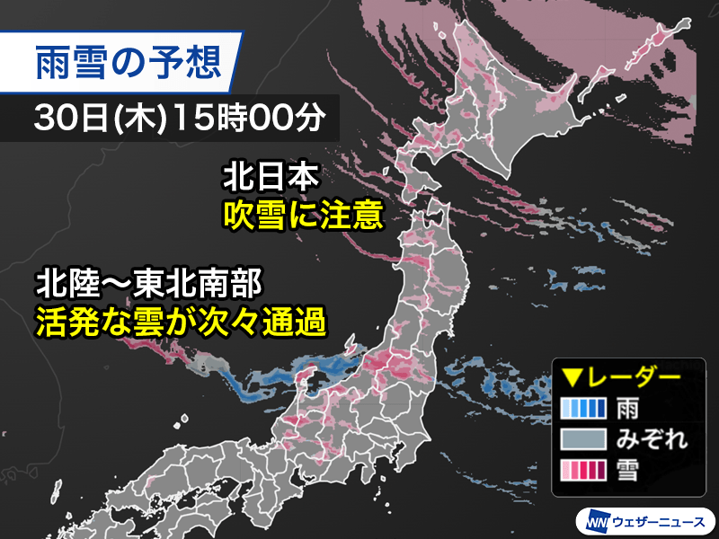 これから午後にかけても活発な雪雲が北陸から東北南部にかかり続ける予想となっています。午後は雲の帯が若干南下するとみられ、関東甲信の北部山沿いや北陸西部の山沿いでも雪が強まる見通しです。
