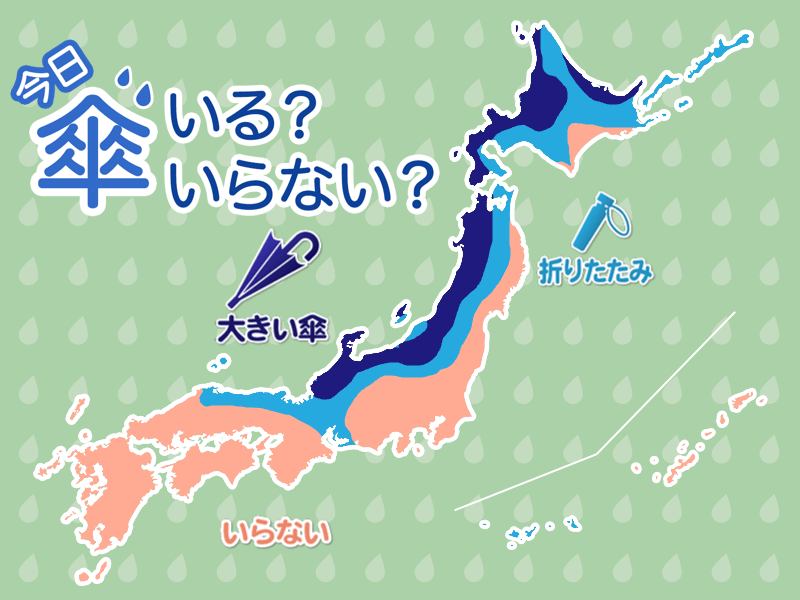 一部太平洋側にも雲が流れ込みます。北日本内陸や東海西部、近畿北部、山陰でも雪や雨の降る可能性があるため、外出の際は折りたたみ傘があると安心です。