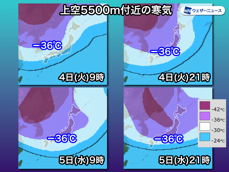 5日(水)には−42℃以下の寒気の中心部分が日本海に進んで、6日(木)にかけて寒波のピークとなります。