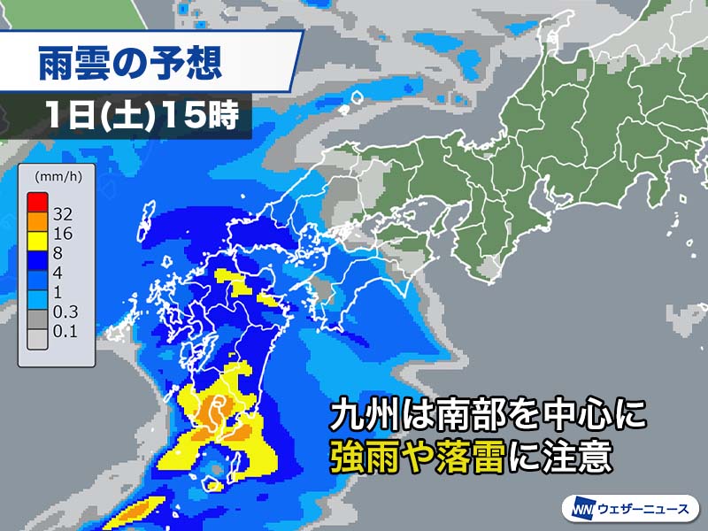 南から流れ込む暖かく湿った空気の影響で雨雲が発達し、九州南部から奄美地方では雷を伴った強い雨の降る所がある予想です。1時間に20mm以上の雨が降って、一時的に小規模な道路冠水が発生する可能性があります。冠水がなくとも、土砂降りになるため大きめの傘があると安心です。