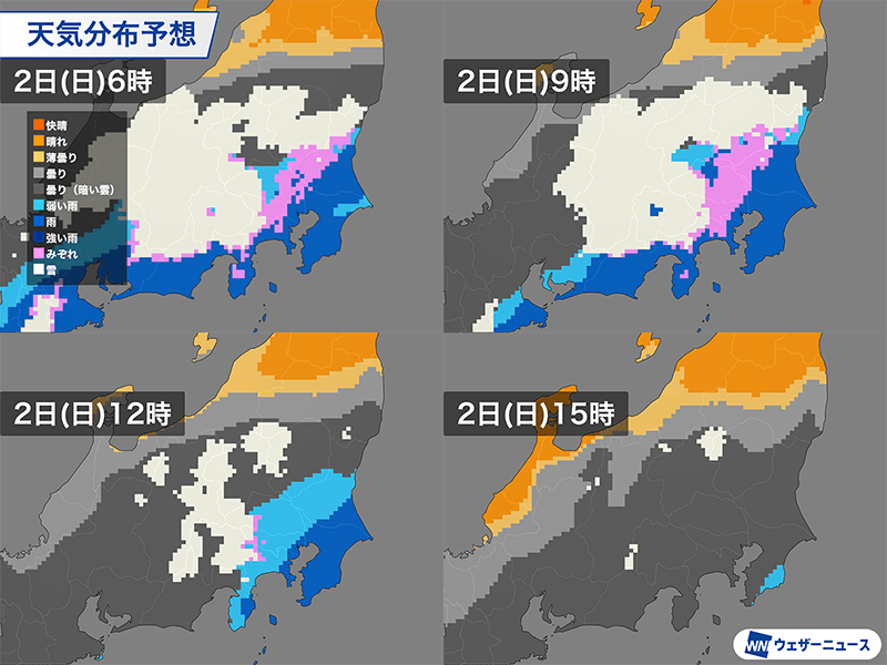 雨や雪は昼すぎまでの所が多く、関東西部・北部の山地や山梨県、長野県では積雪となるおそれがあります。標高の高い所では10cm程度の積雪が予想されます。