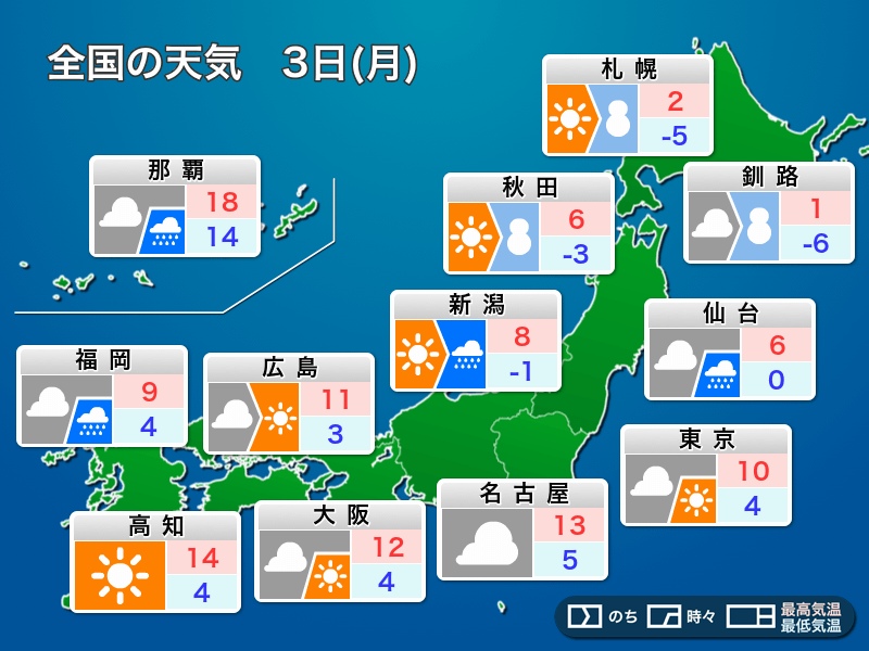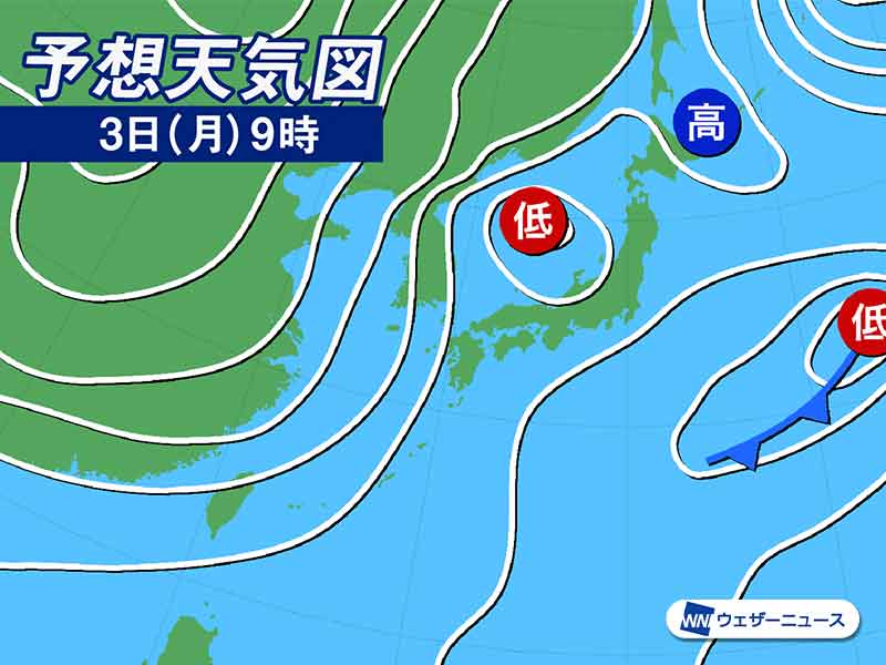 明日3日(月)は太平洋側に雨を降らせた低気圧が東海上に離れますが、日本海には別の低気圧が進んできます。北陸から北の日本海側はだんだんと雨や雪が降り出してくる見込みです。太平洋側も雲の多いスッキリしない天気です。全国的に寒さは控えめです。