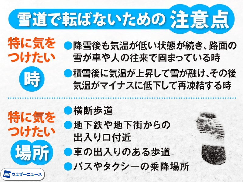 いずれも、人や車の通行によって雪道が踏み固められて滑りやすくなっています。特に横断歩道は、車の熱で雪が融けて凍りやすく、その上タイヤの摩擦で道路が磨かれるのでとても滑りやすいのです。とりわけ白線部は、普通の路面と違って水が浸みこまないため、薄い氷の膜ができやすくなっているので、注意してください。