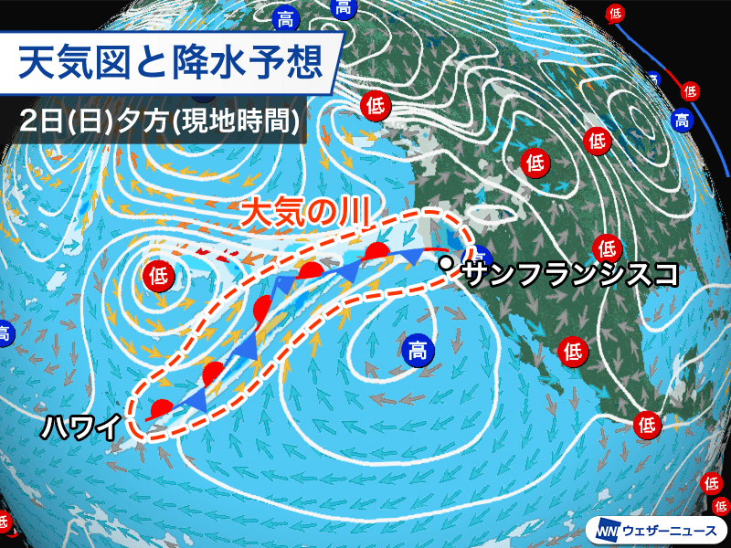 太平洋の真ん中からアメリカ西海岸にかけて、「大気の川」が形成されて水蒸気が流れ込みやすくなっています。ハワイ周辺から西海岸にかけて水蒸気が運ばれてくることから、「パイナップル・エキスプレス」とも呼ばれるパターンです。