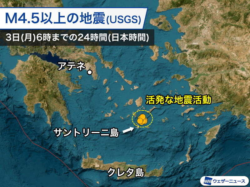 ギリシャ・サントリーニ島周辺で地震活動が活発に