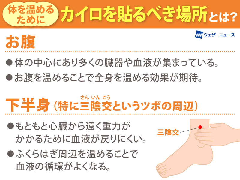 病気のリスクやむくみなどの不調につながるので、冬でも“体が冷える”ことは避けたいところです。体が冷えないようにするには、カイロを使う部位もポイントになります」(石原先生)