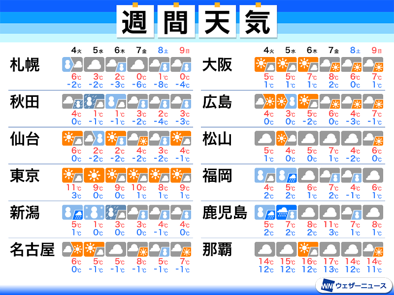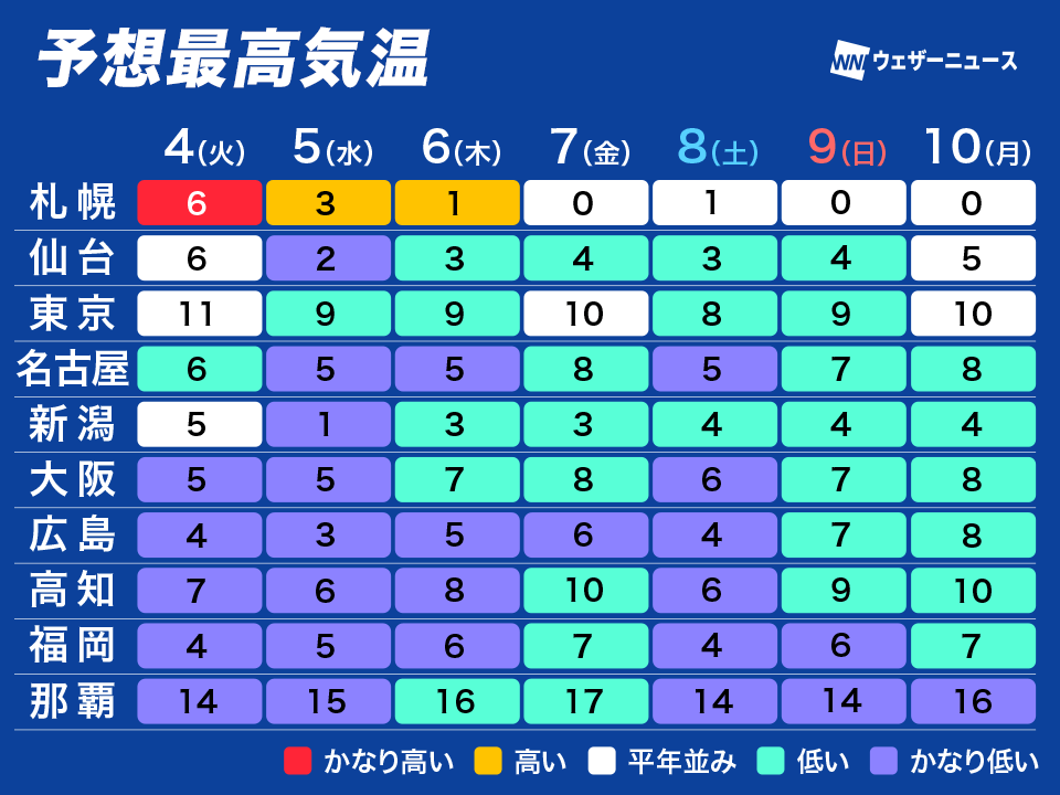 各地の最高気温の予想を見ると、東海から西日本は平年より低い日が続き、特に西日本は平年よりかなり低い日が多いことがわかります。広島では5日(木)は3℃までしか上がらない予想で、昼間も極寒です。那覇も15℃前後と、上着が必要な寒さが続きます。