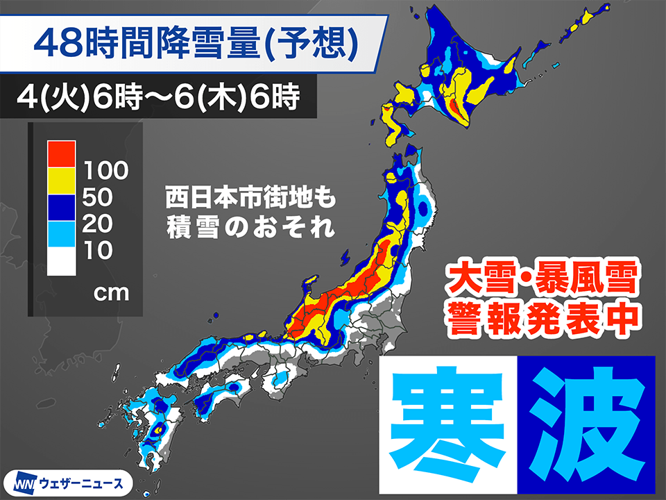 今回の寒波のピークは6日(木)頃にかけてで、日本海側の地域では広い範囲で雪が強まるおそれがあります。短時間で積雪が急増するため、立ち往生の発生などに厳重な警戒が必要です。風も強まるため、猛吹雪による視界不良にも警戒してください。