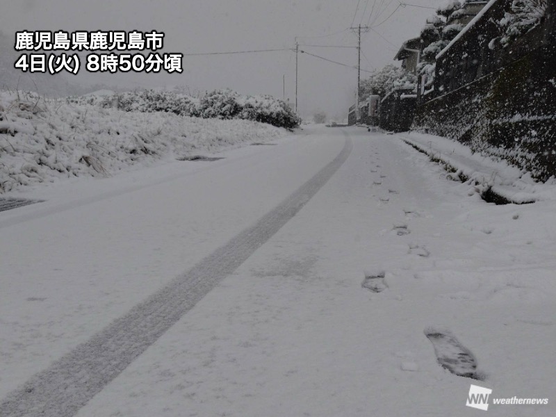この強い寒気の影響で鹿児島市でもしっかりと雪になり、市内中心部では芝生に雪が積もっている所があります。また、山沿いでは道路が真っ白になっています。