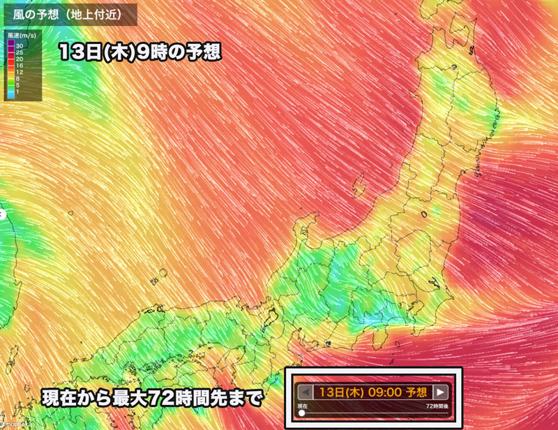 気象情報メニューの「風の予想(地上付近)」は、現在から最大72時間先まで、5kmメッシュ/1時間間隔の高解像度で、全世界の風の動きが視覚的にわかるコンテンツです。風の流れを流線のアニメーションで、風の強さをマップ上に色で表現し、風向や風速の細かい変化が直感的にわかりやすいのが特長です。 強風が予想されている時など、地点を拡大してご確認ください。
