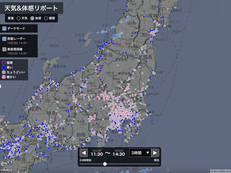 気象情報メニューの「天気&体感リポート」では、ウェザーニュースアプリを利用する皆さんの体感報告を見ることができます。この日は、ちょうどいいや暖かいの報告が多くなっていました。