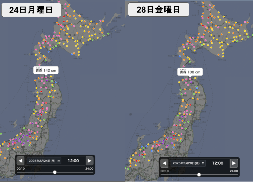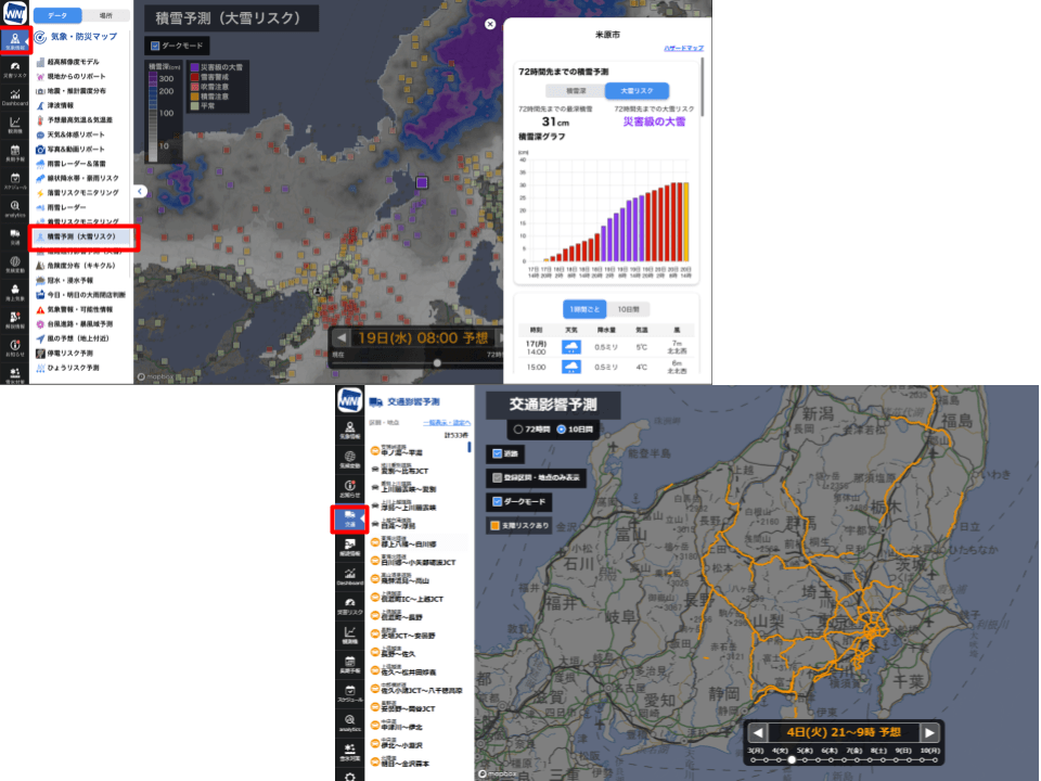 雪による影響は、気象情報メニューの積雪予測(大雪リスク)や交通メニューの鉄道や道路の交通影響予測でご確認いただくことができます。最新の情報をウェザーニュース for businessでこまめにご確認ください。