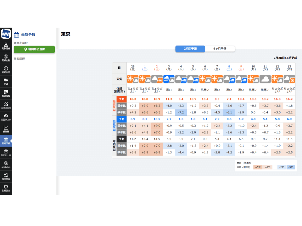 ※交通影響予測や長期予報はオプションメニューとなりますので、ご利用中のウェザーニュース for businessに実装されていない場合がございます。ご興味のある方はぜひお問合せください。