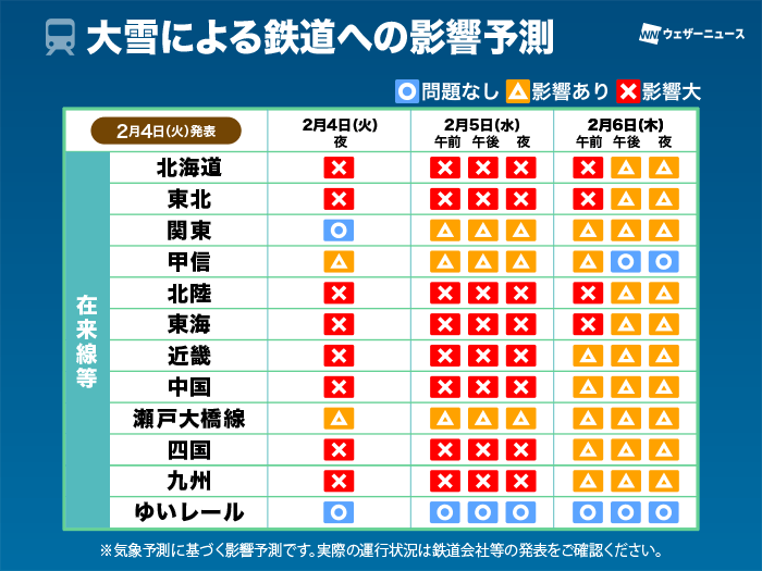 6日(木)にかけては、北日本から北陸、西日本日本海側では大雪や吹雪となり、広い範囲で運転見合わせや運休が発生して、数日にわたるおそれがあります。九州や四国など普段は雪のあまり降らないところでも積雪していきているため、このあとも大きくダイヤが乱れる可能性があります。