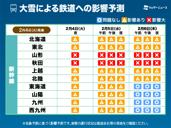 6日(木)にかけて、山形新幹線・秋田新幹線は、大雪により運転見合わせとなるおそれがあります。その他の北海道や北陸方面の新幹線では遅延が発生することが考えられます。また、名古屋〜新大阪間にも雪雲が流れ込み、東海道新幹線でも雪の影響で遅延が発生するおそれがあります。その影響で、接続する山陽新幹線にも遅延が生じるとみています。