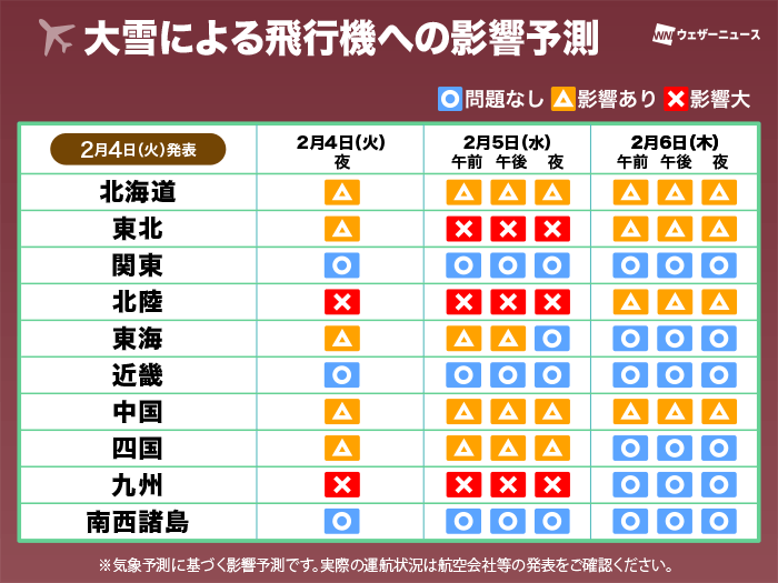5日(水)にかけて、北日本から北陸、西日本日本海側の空港を中心に雪や風が強まり、各空港で欠航または条件付き運航が発生する可能性があります。山陰や北陸、北日本の空港では6日(木)以降も影響が残ることが考えられます。