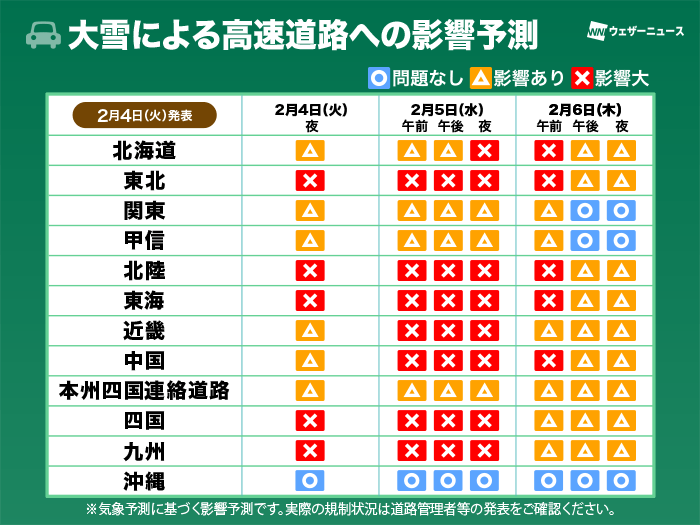 すでに北海道や四国、九州では雪による通行止めが行われ、影響が出始めています。